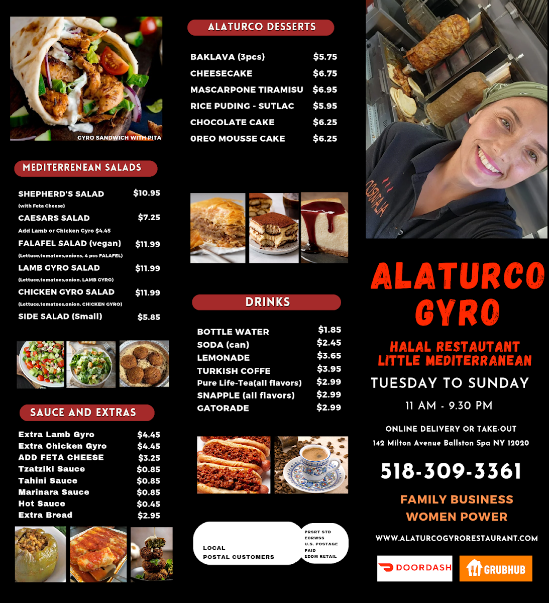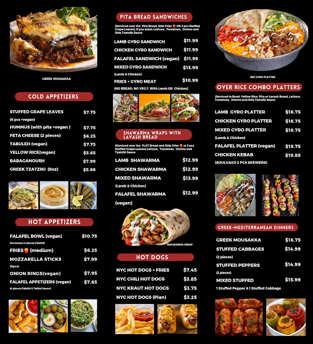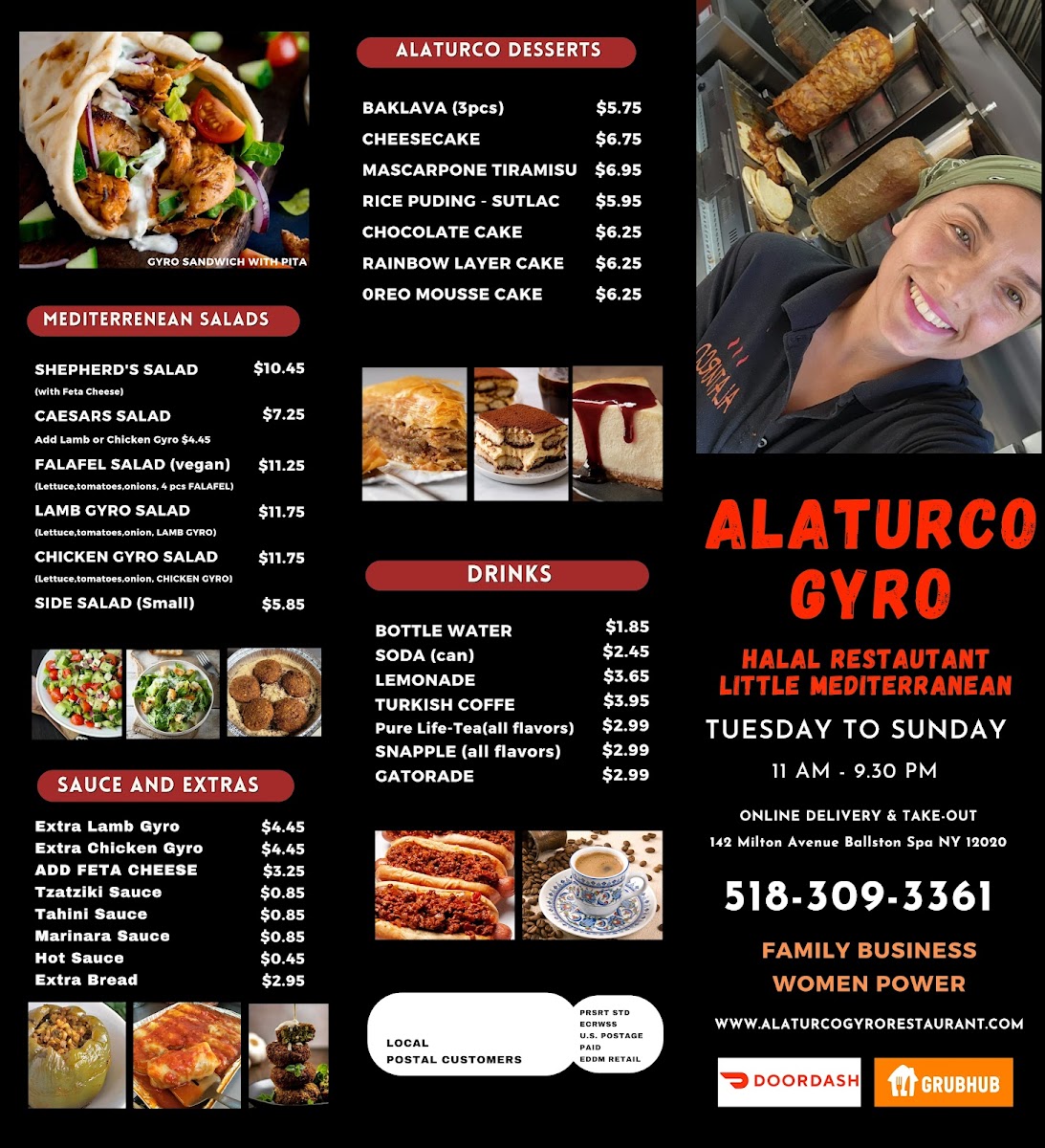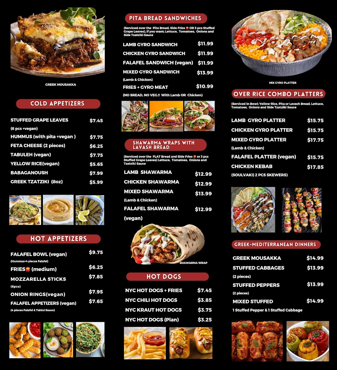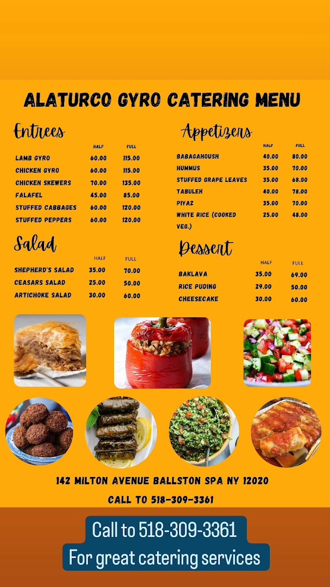 From a reviewer’s perspective, the menu at Alaturco Gyro, located at 142 Milton Ave, Ballston Spa, NY 12020, feels like a well-rounded snapshot of Mediterranean comfort food, carefully designed to satisfy both first-time visitors and returning regulars. The heart of the menu lies in its Mediterranean Platter & Special (Halal) offerings, where generous plates such as the Lamb Gyro Platter, Falafel Platter, Mixed Gyro Platter, and traditional options like Stuffed Cabbages (2 pcs) and Stuffed Peppers (2 pcs) showcase bold spices, hearty portions, and authentic flavors. For a quicker bite, the Sandwich section delivers crowd-pleasing staples including the Falafel Sandwich, Chicken Gyro Sandwich, Lamb Gyro Sandwich, Mixed Gyro Sandwich, and even a comforting twist with Chilli Hot Dogs, making the menu approachable for different tastes.